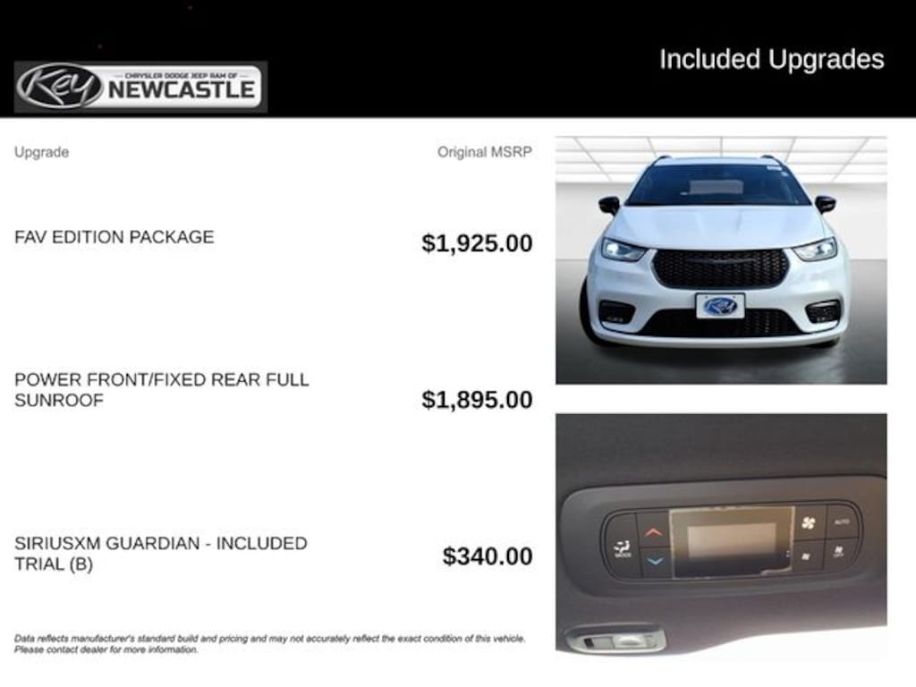 Key Chrysler Dodge Ram of Portsmouth is proud to present you with another True Market Priced Vehicle. This 2025 Chrysler Pacifica Select is loaded with the following Factory Options: FAV Edition Package (All Weather Cargo Floor Mats, All Weather Floor Mats - Stow 'N Go, Black Day Light Opening Moldings, Black Stow 'N Place Roof Rack, Cargo Area Liner, Cargo Container, FAV Exterior Graphics, Front Fascia Air Deflectors, Granite Crystal Exterior Badging, Premium Fascia Upper/Lower Grille w/Black Surround, Premium Rear Fascia Black, Rear Cargo Bin Stow 'N Go Storage, and Wheels: 18" x 7.5" S-Model Aluminum Design 2), Quick Order Package 27L, 10.1" Touchscreen Display, 17" x 7.0" Aluminum Wheels, 3.25 Axle Ratio, 3rd row seats: split-bench, 4-Wheel Disc Brakes, 4G LTE Wi-Fi Hot Spot, 6 Speakers, ABS brakes, Air Conditioning, Alloy wheels, AM/FM radio: SiriusXM, Apple CarPlay, Apple CarPlay/Android Auto, Auto-dimming Rear-View mirror, Automatic temperature control, Black Seats, Brake assist, Bumpers: body-color, Caprice Leatherette Bucket Seats, Compass, Delay-off headlights, Disassociated Touchscreen Display, Driver door bin, Driver vanity mirror, Driver's Seat Mounted Armrest, Dual front impact airbags, Dual front side impact airbags, Electronic Stability Control, Emergency communication system: Chrysler Connect, For Details, Visit DriveUconnect.com, Four wheel independent suspension, Front anti-roll bar, Front Bucket Seats, Front dual zone A/C, Front fog lights, Front reading lights, Fully automatic headlights, Garage door transmitter, Google Android Auto, GPS Antenna Input, Heated door mirrors, Heated front seats, Heated steering wheel, Illuminated entry, Integrated Active Noise Cancellation, Integrated Center Stack Radio, Knee airbag, Low tire pressure warning, Manufacturer's Statement of Origin, Memory seat, Occupant sensing airbag, Outside temperature display, Overhead airbag, Overhead console, Panic alarm, ParkView Rear Back-Up Camera, Passenger door bin, Passenger seat mounted armrest, Passenger vanity mirror, Power door mirrors, Power driver seat, Power Front/Fixed Rear Full Sunroof, Power Liftgate, Power Open/Close Shade, Power steering, Power windows, Radio data system, Radio: Uconnect 5 w/10.1" Display, Rain sensing wipers, Rear air conditioning, Rear reading lights, Rear window defroster, Rear window wiper, Reclining 3rd row seat, Remote keyless entry, Security system, SiriusXM Guardian - Included Trial (B), Speed control, Split folding rear seat, Spoiler, Steering wheel mounted audio controls, Tachometer, Telescoping steering wheel, Tilt steering wheel, Touring Suspension, Traction control, Trip computer, Turn signal indicator mirrors, USB Host Flip, Variably intermittent wipers, and Voltmeter!!