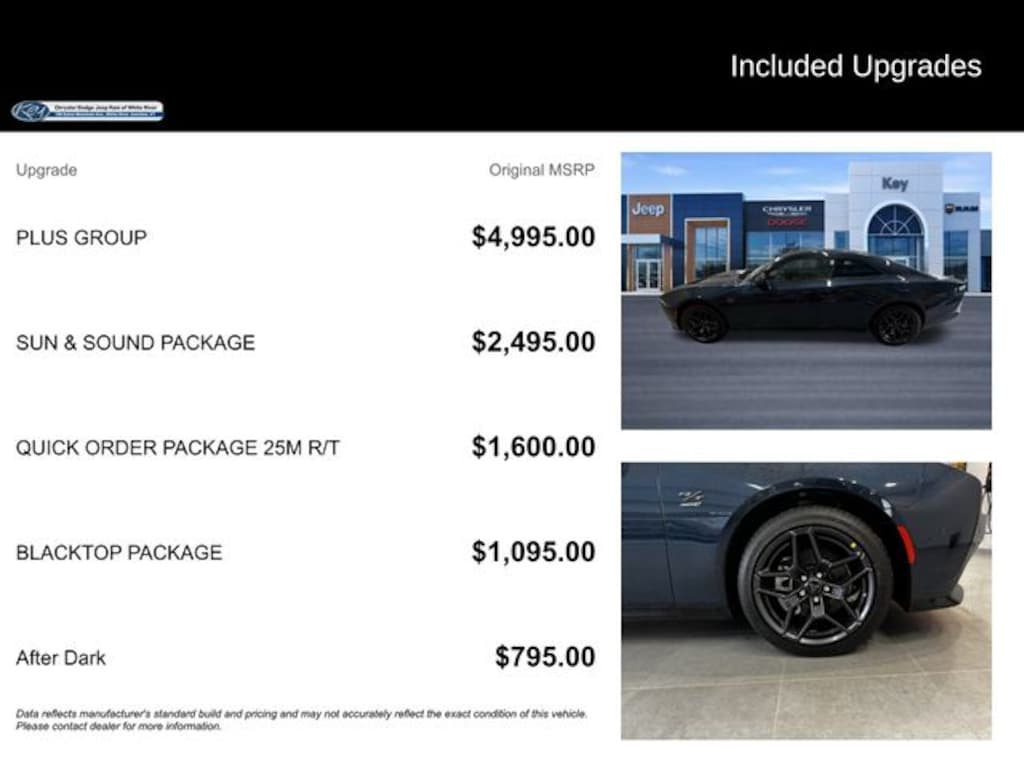 Key Chrysler Dodge Jeep Ram of White River is proud to present you with another True Market Priced Vehicle. This 2024 Dodge Charger R/T is loaded with the following Factory Options: Blacktop Package (Dark Exterior Badging and Nexen Brand Tires), AWD, Black Artificial Leather, 16" Color Driver Display, 18 High Performance Alpine Speakers w/Subwoofer, Full Glass Roof, Heads-Up Display, Heated Front Seats, Heated Second Row Seats, Map-In-Cluster Display, Navigation system: TomTom, Ventilated Front Seats, and Wireless Charging Pad Blacktop Package (Dark Exterior Badging and Nexen Brand Tires), Plus Group (16" Color Driver Display, Heads-Up Display, Heated Front Seats, Heated Second Row Seats, Map-In-Cluster Display, Ventilated Front Seats, Wireless Charging Pad, 2-Way Manual Adjust Head Restraints, 2-Way Power Driver Lumbar Adjust, 20" x 9" Aluminum Wheels, 8-Way Power Driver Seat Adjust, Ambient Light Color Control, Automatic High-Beam Headlamp Control, Black Color Multi-Function Mirrors, Bright Pedals, Enhanced Security Alarm, Exterior Mirrors Logo Lamps, Exterior Mirrors w/Memory, Front Cubby Bin w/Light, Frunk, Glove Box Lamp, Heated Exterior Mirrors, Illuminated Door Pull Handles, Leatherette Seats, LED Footwell Lighting, LED Map Pockets, Low Back Bucket Seats, Power 2-Way Passenger Lumbar Adjust, Power Adjust 8-Way Front Passenger Seat, Power Adjust Mirrors, Power Hatch, Power Tilt/Telescope Steering Column, Power Windows Global Down w/Key Fob, Premium Door Trim Panel, Premium Instrument Panel, Premium Interior Accents, Premium LED Low-High Reflective Headlamps, Radio, Driver Seat, Mirrors & Steering Column Memory, Rain Sensitive Windshield Wipers, Surround View Camera System, and Windshield Wiper De-Icer), Quick Order Package 25M R/T, Sun & Sound Package (18 High Performance Alpine Speakers w/Subwoofer and Full Glass Roof), Two Tone Paint Group, AWD, Black Artificial Leather, Navigation system: TomTom, 10 Speakers, 18" x 8.5" Aluminum Wheels, 4-Wheel Disc Brakes, ABS brakes, Air Conditioning, Alloy wheels, AM/FM radio: SiriusXM w/360L, Apple CarPlay/Android Auto, Auto-dimming Rear-View mirror, Automatic temperature control, Black Seats, Brake assist, Bumpers: body-color, Compass, Delay-off headlights, Driver door bin, Driver vanity mirror, Dual front impact airbags, Dual front side impact airbags, Electronic Stability Control, Emergency communication system: Dodge Connect, Four wheel independent suspension, Front anti-roll bar, Front Bucket Seats, Front Center Armrest, Front dual zone A/C, Front License Plate Bracket, Front reading lights, Fully automatic headlights, Garage door transmitter, Heated door mirrors, Heated front seats, Heated steering wheel, Illuminated entry, Knee airbag, Leather Shift Knob, Leatherette/Cloth Performance Seats, Low tire pressure