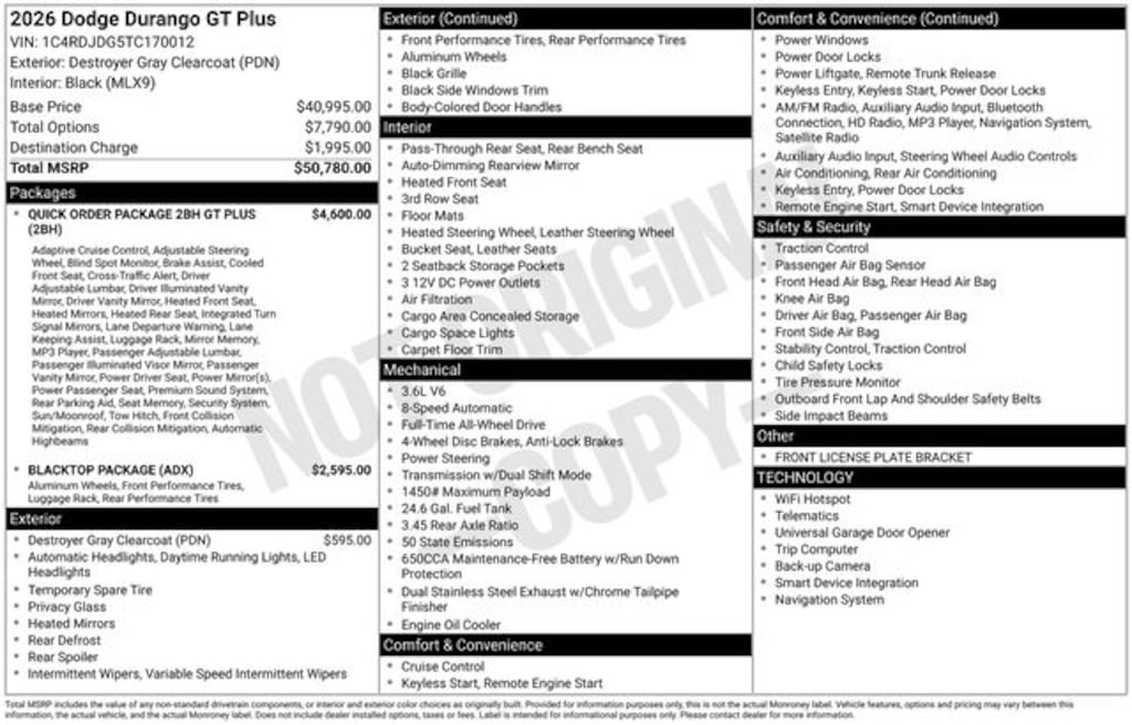 Key Chrysler Dodge Ram of Portsmouth is proud to present you with another True Market Priced Vehicle. This 2026 Dodge Durango GT Plus is loaded with the following Factory Options: AWD Blacktop Package (Black Roof Rails, Gloss Black Badges, GT Gloss Black Badging, Integrated Roof Rail Crossbars, Satin Black Dodge Tail Lamp Badge, and Wheels: 20" x 8" Black Noise Aluminum), Quick Order Package 2BH GT Plus (115V Auxiliary Power Outlet, 180 Amp Alternator, 506 Watt Amplifier, 7 and 4 Pin Wiring Harness, 9 Alpine Amplified Speakers with Subwoofer, Adaptive Cruise Control with Stop, Advanced Brake Assist, Auto High Beam Headlamp Control, Auto-Dimming Exterior Driver Mirror, Blind Spot with Trailer Detection, Bright Cargo Area Scuff Pads, Class IV Receiver Hitch, Dual Remote USB Port - Charge Only, Exterior Mirrors with Heating Element, Exterior Mirrors with Memory, Exterior Mirrors with Supplemental Signals, Full Speed Forward Collision Warning Plus, Gloss Black Exterior Mirrors, Heated Second Row Seats, Heavy-Duty Engine Cooling, Lane Departure Warning Plus, Leather Trimmed Bucket Seats, Leather Wrapped Door Panels, LED Auxiliary Low Beam and Turn Signal, ParkSense Front/Rear Park Assist with Stop, Power 6x9 Multi-Function Foldaway Mirrors, Power 8-Way Driver Memory 8-Way Passenger Seats, Power Driver/Passenger 4-Way Lumbar Adjust, Power Sunroof, Power Tilt and Telescopic Steering Column, Rear Load Leveling Suspension, Red Accent Stitching, Security Alarm, Sun Visors with Illuminated Vanity Mirrors, Trailer Brake Control, Ventilated Front Seats, and Wireless Charging Pad), AWD, 3.45 Rear Axle Ratio, 3rd row seats: split-bench, 4-Wheel Disc Brakes, 6 Speakers, ABS brakes, Air Conditioning, Alloy wheels, AM/FM radio: SiriusXM w/360L, Apple CarPlay/Android Auto, Auto-dimming Rear-View mirror, Automatic temperature control, Brake assist, Bumpers: body-color, Cloth Bucket Seats with Shift Insert, Compass, Delay-off headlights, Driver door bin, Driver vanity mirror, Dual front impact airbags, Dual front side impact airbags, Electronic Stability Control, Emergency communication system: Dodge Connect, Four wheel independent suspension, Front anti-roll bar, Front Bucket Seats, Front Center Armrest w/Storage, Front dual zone A/C, Front License Plate Bracket, Front reading lights, Fully automatic headlights, Garage door transmitter, Heated door mirrors, Heated front seats, Heated steering wheel, Illuminated entry, Knee airbag, Leather steering wheel, Low tire pressure warning, Navigation System, Occupant sensing airbag, Outside temperature display, Overhead airbag, Overhead console, Panic alarm, ParkView Rear Back-Up Camera, Passenger door bin, Passenger vanity mirror, Power door mirrors, Power driver seat, Power Liftgate, Power steering, Power windows, Radio data system, Radio: Uconnect 5 Nav with 10.1" Display, Rear air conditioning, Rear anti-roll bar, Rear reading lights, Rear seat center arm