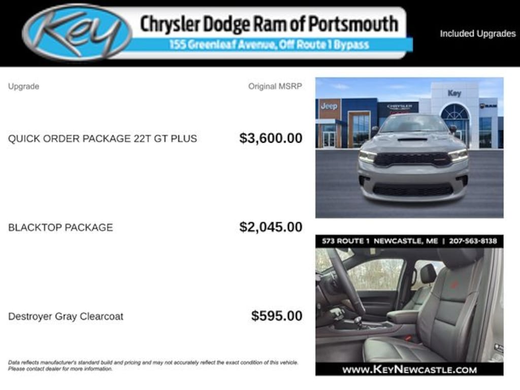 Key Chrysler Dodge Ram of Portsmouth is proud to present you with another True Market Priced Vehicle. This 2026 Dodge Durango GT is loaded with the following Factory Options: AWD Blacktop Package (Black Roof Rails, Gloss Black Badges, and Satin Black Dodge Tail Lamp Badge), Blacktop Package with DB Black Clearcoat, Quick Order Package 22T GT Plus (Adaptive Cruise Control with Stop, Blind Spot with Trailer Detection, Class IV Receiver Hitch, Exterior Mirrors with Heating Element, Exterior Mirrors with Memory, Exterior Mirrors with Supplemental Signals, Gloss Black Exterior Mirrors, LED Auxiliary Low Beam and Turn Signal, Power 6x9 Multi-Function Foldaway Mirrors, Red Accent Stitching, and Ventilated Front Seats), AWD, 3.09 Rear Axle Ratio, 3rd row seats: split-bench, 4-Wheel Disc Brakes, 9 Speakers, ABS brakes, Air Conditioning, Alloy wheels, AM/FM radio: SiriusXM w/360L, Apple CarPlay/Android Auto, Auto-dimming Rear-View mirror, Auto-leveling suspension, Automatic temperature control, Brake assist, Bumpers: body-color, Cloth Bucket Seats with Shift Insert, Compass, Delay-off headlights, Driver door bin, Driver vanity mirror, Dual front impact airbags, Dual front side impact airbags, Electronic Stability Control, Emergency communication system: Dodge Connect, Four wheel independent suspension, Front anti-roll bar, Front Bucket Seats, Front Center Armrest w/Storage, Front dual zone A/C, Front License Plate Bracket, Front reading lights, Fully automatic headlights, Garage door transmitter, Heated door mirrors, Heated front seats, Heated steering wheel, Illuminated entry, Knee airbag, Leather steering wheel, Low tire pressure warning, Navigation System, Occupant sensing airbag, Outside temperature display, Overhead airbag, Overhead console, Panic alarm, ParkView Rear Back-Up Camera, Passenger door bin, Passenger vanity mirror, Power door mirrors, Power driver seat, Power Liftgate, Power steering, Power windows, Radio data system, Radio: Uconnect 5 Nav with 10.1" Display, Rain sensing wipers, Rear air conditioning, Rear anti-roll bar, Rear Load Leveling Suspension, Rear reading lights, Rear seat center armrest, Rear window defroster, Rear window wiper, Remote keyless entry, Security system, Speed control, Speed-sensing steering, Speed-Sensitive Wipers, Split folding rear seat, Spoiler, Sport steering wheel, Steering wheel mounted audio controls, Tachometer, Telescoping steering wheel, Tilt steering wheel, Traction control, Trip computer, Variably intermittent wipers, Voltmeter, Wheels: 20" x 8" Black Noise Split 5-Spoke, and Wheels: 20" x 8" Satin Carbon Split 5-Spoke!!