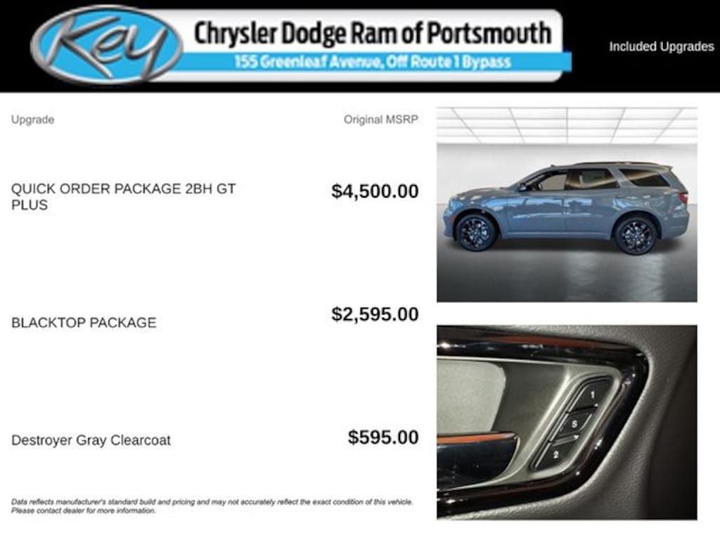 Key Chrysler Dodge Ram of Portsmouth is proud to present you with another True Market Priced Vehicle. This 2026 Dodge Durango GT Plus is loaded with the following Factory Options: AWD Blacktop Package (Black Roof Rails, Gloss Black Badges, Gloss Black Exterior Mirrors, GT Gloss Black Badging, Integrated Roof Rail Crossbars, Satin Black Dodge Tail Lamp Badge, and Wheels: 20" x 8" Black Noise Aluminum), Quick Order Package 2BH GT Plus (115V Auxiliary Power Outlet, 180 Amp Alternator, 506 Watt Amplifier, 7 & 4 Pin Wiring Harness, 9 Alpine Amplified Speakers w/Subwoofer, Adaptive Cruise Control w/Stop, Advanced Brake Assist, Auto High Beam Headlamp Control, Auto-Dimming Exterior Driver Mirror, Blind Spot w/Trailer Detection, Bright Cargo Area Scuff Pads, Class IV Receiver Hitch, Dual Remote USB Port - Charge Only, Exterior Mirrors w/Heating Element, Exterior Mirrors w/Memory, Exterior Mirrors w/Supplemental Signals, Full Speed Forward Collision Warning Plus, Heated Second Row Seats, Heavy-Duty Engine Cooling, Lane Departure Warning Plus, Leather Trimmed Bucket Seats, Leather Wrapped Door Panels, LED Auxiliary Low Beam & Turn Signal, ParkSense Front/Rear Park Assist w/Stop, Power 6x9 Multi-Function Foldaway Mirrors, Power 8-Way Driver Memory 8-Way Passenger Seats, Power Driver/Passenger 4-Way Lumbar Adjust, Power Sunroof, Power Tilt & Telescopic Steering Column, Rear Load Leveling Suspension, Red Accent Stitching, Security Alarm, Sun Visors w/Illuminated Vanity Mirrors, Trailer Brake Control, Ventilated Front Seats, and Wireless Charging Pad), AWD, 3.45 Rear Axle Ratio, 3rd row seats: split-bench, 4-Wheel Disc Brakes, 6 Speakers, ABS brakes, Air Conditioning, Alloy wheels, AM/FM radio: SiriusXM w/360L, Apple CarPlay/Android Auto, Auto-dimming Rear-View mirror, Automatic temperature control, Brake assist, Bumpers: body-color, Cloth Bucket Seats w/Shift Insert, Compass, Delay-off headlights, Driver door bin, Driver vanity mirror, Dual front impact airbags, Dual front side impact airbags, Electronic Stability Control, Emergency communication system: Dodge Connect, Four wheel independent suspension, Front anti-roll bar, Front Bucket Seats, Front Center Armrest w/Storage, Front dual zone A/C, Front License Plate Bracket, Front reading lights, Fully automatic headlights, Garage door transmitter, Heated door mirrors, Heated front seats, Heated steering wheel, Illuminated entry, Knee airbag, Leather steering wheel, Low tire pressure warning, Navigation System, Occupant sensing airbag, Outside temperature display, Overhead airbag, Overhead console, Panic alarm, ParkView Rear Back-Up Camera, Passenger door bin, Passenger vanity mirror, Power door mirrors, Power driver seat, Power Liftgate, Power steering, Power windows, Radio data system, Radio: Uconnect 5 Nav w/10.1" Display, Rear air conditioning, Rear anti-roll bar, Rear reading lights, Rear seat center armrest, Rear window defroster, Rear wi