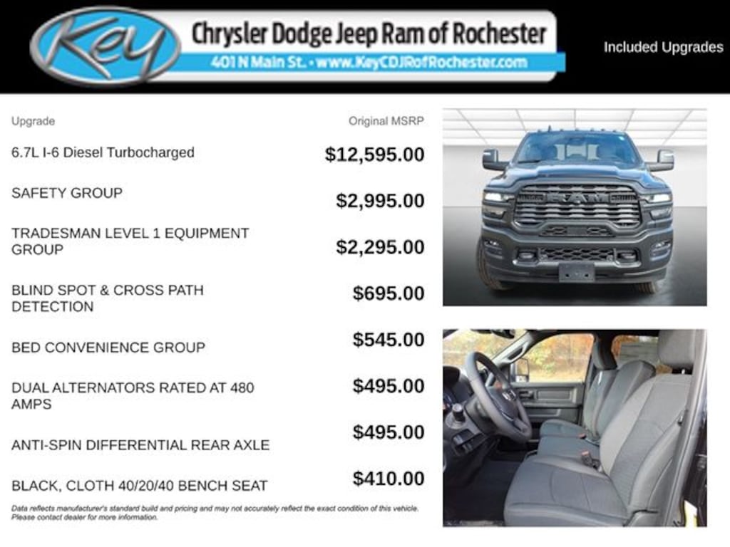 Key Chrysler Dodge Jeep Ram of Rochester is proud to present you with another True Market Priced Vehicle. This 2025 Ram 2500 Tradesman is loaded with the following Factory Options: Bed Convenience Group (LED Bed Lighting and MOPAR Spray In Bedliner), Quick Order Package 24A Tradesman, Safety Group (Active Lane Management System, Adaptive Steering System, Auto High Beam Headlamp Control, Auto-Dimming Rear-View Mirror, Cluster 7.0" TFT Color Display, Drowsy Driver Detection, Luxury Steering Wheel, Rain Sensitive Windshield Wipers, Steering Wheel Mounted Audio Controls, and Traffic Sign Recognition), Tradesman Level 1 Equipment Group (115V Auxiliary Front Power Outlet, 12" Touchscreen Display, 2 Way Rear Headrest Seat, 4 Way Front Headrests, 40/20/40 Split Bench Seat, 400W Inverter, 4G LTE Wi-Fi Hot Spot, Air Conditioning ATC w/Dual Zone Control, Alexa Built-In, Anti-Spin Differential Rear Axle, Apple CarPlay, Black Exterior Mirrors, Carpet Floor Covering, Cloth 40/20/40 Bench Seat, Connected Travel & Traffic Services, Connectivity - US/Canada, Disassociated Touchscreen Display, Emergency Vehicle Alert System (EVAS), Exterior 115V AC Outlet, Exterior Mirrors Courtesy Lamps, Exterior Mirrors w/Heating Element, Exterior Mirrors w/Supplemental Signals, Front & Rear Floor Mats, Front Armrest w/Cupholders, Global Telematics Box Module (TBM), Google Android Auto, GPS Antenna Input, GPS Navigation, HD Radio, Integrated Voice Command w/Bluetooth, Manual Adjust 4-Way Driver Seat, Manual Adjust 4-Way Front Passenger Seat, Manual Folding Exterior Mirrors, Manual Telescoping Mirrors, Mirror Running Lights, Mopar Black Tubular Side Steps, Off-Road Info Pages, ParkSense Front/Rear Park Assist System, Power Adjust Mirrors, Power Adjustable Convex Aux Mirrors, Power Heated Folding Telescope Mirrors, Radio: Uconnect 5 Nav w/12.0" Display, Rear Folding Seat, Rear Power Sliding Window, Remote USB Port - Charge Only, Selectable Tire Fill Alert, SiriusXM Radio Service, SiriusXM w/360L, Storage Tray, Tinted Acoustic Windshield Glass, and Trailer Tow Pages), 4-Wheel Disc Brakes, 6 Speakers, ABS brakes, Air Conditioning, AM/FM radio: SiriusXM, Apple CarPlay/Android Auto, Black Wheel Center Hub, Blind Spot & Cross Path Detection, Brake assist, Clearance Lamps, Compass, Delay-off headlights, Driver door bin, Dual Alternators Rated at 480 Amps, Dual front impact airbags, Dual front side impact airbags, Electronic Stability Control, Front anti-roll bar, Front Center Armrest w/Storage, Front fog lights, Front License Plate Bracket, Front reading lights, Fully automatic headlights, Heavy Duty Vinyl 40/20/40 Split Bench Seat, Illuminated entry, LED Tail Lamps, Low tire pressure warning, Manufacturer's Statement of Origin, MOPAR Front & Rear Rubber Floor Mats, Occupant sensing airbag, Outside temperature display, Overhead airbag, Overhead console, Panic alarm, ParkView Rear Back-Up Camera, Passenger door bin, Passenger vanity mirror, Power steering, Power windows, Radio Call us to ask about conditional rebates. Price includes: $2000 - 2025 National Bonus Cash . Exp. 01/05/2026 $2000 - 2025 National Holiday Select Inventory Bon