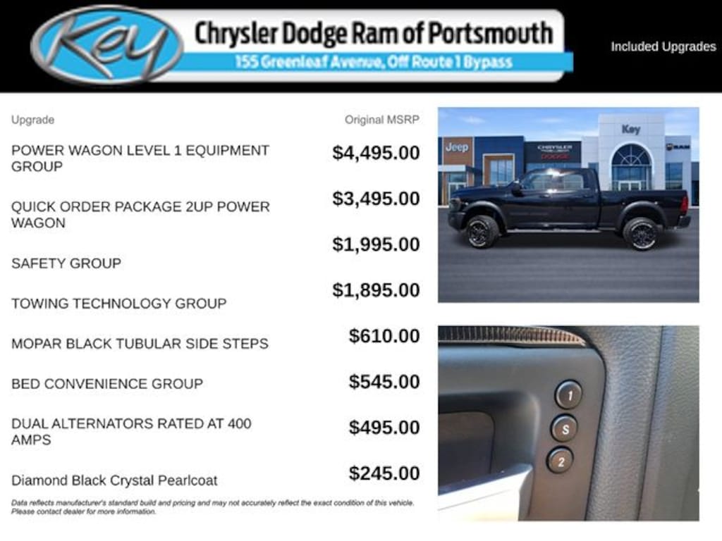 Key Chrysler Dodge Ram of Portsmouth is proud to present you with another True Market Priced Vehicle. This 2025 Ram 2500 Rebel is loaded with the following Factory Options: Bed Convenience Group (LED Bed Lighting and MOPAR Spray In Bedliner), Power Wagon Level 1 Equipment Group (115V Auxiliary Rear Power Outlet, 2 Way Rear Headrest Seat, 4 Way Front Headrests, 9 Alpine Speakers w/Subwoofer, Auto Adjust In Reverse Exterior Mirrors, Auto Dim Exterior Mirror, Auto High Beam Headlamp Control, Auto Power-Folding Mirrors, Auto-Dimming Exterior Passenger Mirror, Black Exterior Mirrors, Body Color Door Handles, Bucket Seats, Dual Wireless Charging Pad, Exterior Mirrors Courtesy Lamps, Exterior Mirrors w/Heating Element, Exterior Mirrors w/Memory, Exterior Mirrors w/Supplemental Signals, Folding Flat Load Floor Storage, Forward & Reverse Utility Lights, Front Door Locks 2-Door Passive Entry, Front Electric Winch, Front Seat Back Map Pockets, Full Length Upgraded Floor Console, Heated Front Seats, Heated Second Row Seats, Heated Steering Wheel, High Back Seats, Leather Trimmed Bucket Seats, LED Dome Lamp w/On/Off Switch, LED Interior Lighting, Media Hub w/2 Charge Only USBs, Mirror Running Lights, MOPAR Front & Rear Rubber Floor Mats, Overhead LED Lamps, Power 2-Way Driver Lumbar Adjust, Power 2-Way Passenger Lumbar Adjust, Power Adjust 8-Way Driver Seat, Power Adjust 8-Way Front Passenger Seat, Power Adjust Mirrors, Power Adjustable Convex Aux Mirrors, Power Adjustable Pedals w/Memory, Power Heated Fold Telescopic Mirrors w/Memory, Power Telescoping Mirrors, Premium Overhead Console, Radio/Driver Seat/Mirrors/Pedals Memory, Rain Sensitive Windshield Wipers, Rear 60/40 Folding Seat, Sport Performance Hood, Sun Visors w/Illuminated Vanity Mirrors, Universal Garage Door Opener, and Ventilated Front Seats), Power Wagon Off-Road Group, Quick Order Package 2UP Power Wagon (Black Wheel Center Hub, Front Disconnecting Stabilizer Bar, Power Wagon Instrument Cluster Theme 5, Power Wagon Instrument Panel Spec Plate, Raised Ride Height, RAM Articulink Suspension, Tru-Lok Front & Rear Axles, and Wheels: 17" x 8.0" Black Painted Aluminum), Safety Group (Active Lane Management System, Adaptive Steering System, Drowsy Driver Detection, and Traffic Sign Recognition), Towing Technology Group (CTR Stop Lamp w/Cargo View Camera, Surround View Camera System, Trailer Reverse Guidance, and Trailer Tire Pressure Monitoring System), 4-Wheel Disc Brakes, 4G LTE Wi-Fi Hot Spot, 6 Speakers, ABS brakes, Adjustable pedals, Air Conditioning, Alexa Built-In, Alloy wheels, AM/FM radio: SiriusXM with 360L, Apple CarPlay, Apple CarPlay/Android Auto, Auto-dimming Rear-View mirror, Automatic temperature control, Block heater, Brake assist, Cloth Heated Power Bench Seat, Compass, Connected Travel & Traffic Services, Connectivity - US/Canada, Delay-off headlights, Disassociated Touchscreen Display, Driver door bin, Dual Alternators Rated At