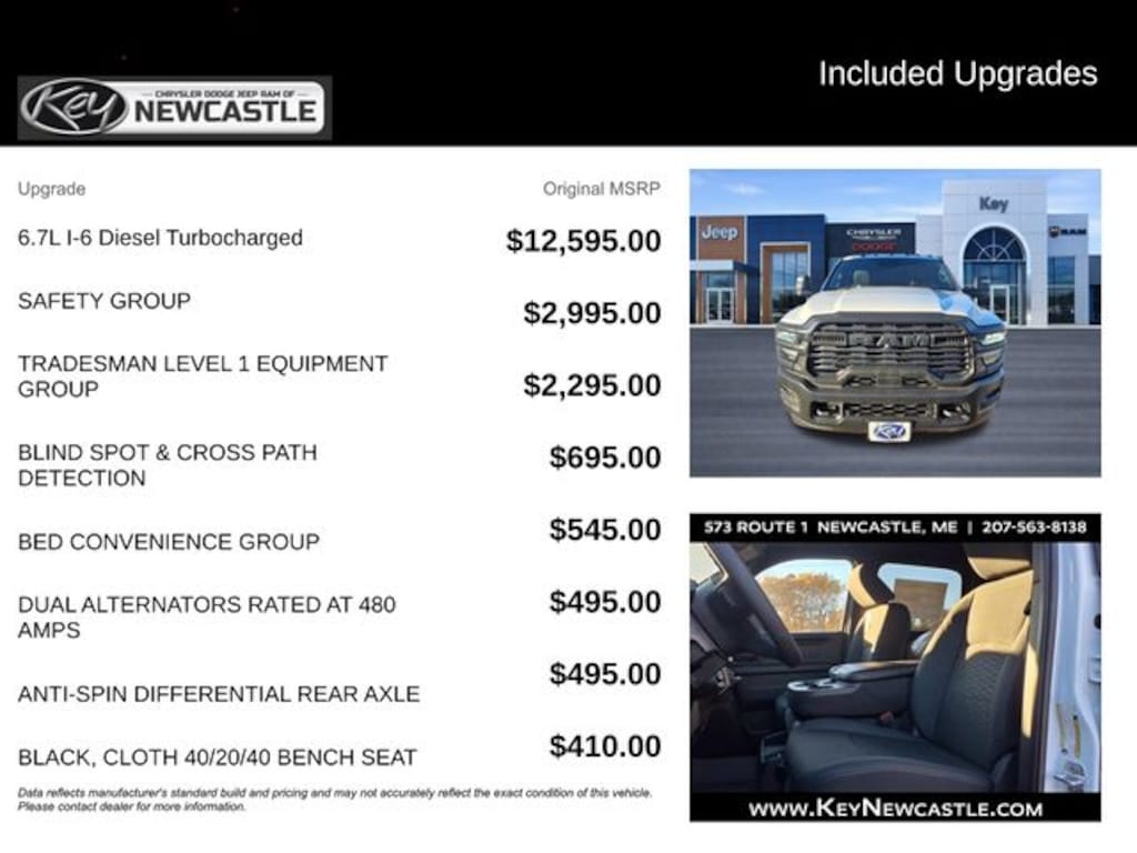 Key Chrysler Dodge Jeep Ram Newcastle is proud to present you with another True Market Priced Vehicle. This 2025 Ram 2500 Tradesman is loaded with the following Factory Options: Bed Convenience Group (LED Bed Lighting and MOPAR Spray In Bedliner), Quick Order Package 24A Tradesman, Safety Group (Active Lane Management System, Adaptive Steering System, Auto High Beam Headlamp Control, Auto-Dimming Rear-View Mirror, Cluster 7.0" TFT Color Display, Drowsy Driver Detection, Luxury Steering Wheel, Rain Sensitive Windshield Wipers, Steering Wheel Mounted Audio Controls, and Traffic Sign Recognition), Tradesman Level 1 Equipment Group (115V Auxiliary Front Power Outlet, 12" Touchscreen Display, 2 Way Rear Headrest Seat, 4 Way Front Headrests, 40/20/40 Split Bench Seat, 400W Inverter, 4G LTE Wi-Fi Hot Spot, Air Conditioning ATC w/Dual Zone Control, Alexa Built-In, Anti-Spin Differential Rear Axle, Apple CarPlay, Black Exterior Mirrors, Carpet Floor Covering, Cloth 40/20/40 Bench Seat, Connected Travel & Traffic Services, Connectivity - US/Canada, Disassociated Touchscreen Display, Emergency Vehicle Alert System (EVAS), Exterior 115V AC Outlet, Exterior Mirrors Courtesy Lamps, Exterior Mirrors w/Heating Element, Exterior Mirrors w/Supplemental Signals, Front & Rear Floor Mats, Front Armrest w/Cupholders, Global Telematics Box Module (TBM), Google Android Auto, GPS Antenna Input, GPS Navigation, HD Radio, Integrated Voice Command w/Bluetooth, Manual Adjust 4-Way Driver Seat, Manual Adjust 4-Way Front Passenger Seat, Manual Folding Exterior Mirrors, Manual Telescoping Mirrors, Mirror Running Lights, Mopar Black Tubular Side Steps, Off-Road Info Pages, ParkSense Front/Rear Park Assist System, Power Adjust Mirrors, Power Adjustable Convex Aux Mirrors, Power Heated Folding Telescope Mirrors, Radio: Uconnect 5 Nav w/12.0" Display, Rear Folding Seat, Rear Power Sliding Window, Remote USB Port - Charge Only, Selectable Tire Fill Alert, SiriusXM Radio Service, SiriusXM w/360L, Storage Tray, Tinted Acoustic Windshield Glass, and Trailer Tow Pages), 4-Wheel Disc Brakes, 6 Speakers, ABS brakes, Air Conditioning, AM/FM radio: SiriusXM, Apple CarPlay/Android Auto, Black Wheel Center Hub, Blind Spot & Cross Path Detection, Brake assist, Clearance Lamps, Compass, Delay-off headlights, Driver door bin, Dual Alternators Rated at 480 Amps, Dual front impact airbags, Dual front side impact airbags, Electronic Stability Control, Front anti-roll bar, Front Center Armrest w/Storage, Front fog lights, Front License Plate Bracket, Front reading lights, Fully automatic headlights, Heavy Duty Vinyl 40/20/40 Split Bench Seat, Illuminated entry, LED Tail Lamps, Low tire pressure warning, Manufacturer's Statement of Origin, MOPAR Front & Rear Rubber Floor Mats, Occupant sensing airbag, Outside temperature display, Overhead airbag, Overhead console, Panic alarm, ParkView Rear Back-Up Camera, Passenger door bin, Passenger vanity mirror, Power steering, Power windows, Radio data system, Radio: Uconnect 5 w/8.4" Display, Rear anti-roll bar, Rear step bumper, Rear window defroster, Red Tail Lamp Bezels, Remote keyless entry, Speed control, Tachometer, Tilt steering wheel, Traction control, Variably intermittent wipers, Voltmeter, Wheels: 17" x 7.5" Black Steel Styled, and Wheels: 18" x 8.0" Black Painted Steel!!