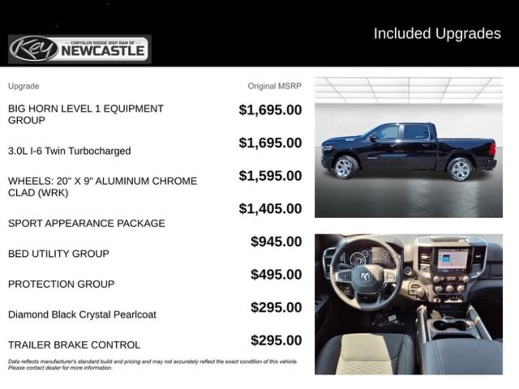 Key Chrysler Dodge Ram of Portsmouth is proud to present you with another True Market Priced Vehicle. This 2026 Ram 1500 Big Horn/Lone Star is loaded with the following Factory Options: Bed Utility Group (Exterior 115V AC Outlet, MOPAR 4 Adjustable Cargo Tie-Down Hooks, MOPAR Spray In Bedliner, and Pick-Up Box Lighting), Big Horn Level 1 Equipment Group (115V Auxiliary Power Outlet, 2nd Row In Floor Storage Bins, 3 Rear Seat Head Restraints, 4 Way Front Headrests, 400W Inverter, Auto Power-Folding Mirrors, Auto-Dimming Exterior Driver Mirror, Auto-Dimming Rear-View Mirror, Black Exterior Mirrors, Black Premium Power Mirrors, Body Color Fender Flares, Bucket Seats, Center Console Parts Module, Convex Wide-Angle Exterior Mirror Insert, Deluxe Cloth Bucket Seats, Exterior Mirrors Courtesy Lamps, Exterior Mirrors w/Heating Element, Exterior Mirrors w/Supplemental Signals, Front Seat Back Map Pockets, Full Length Floor Console, Glove Box Lamp, Heated Front Seats, Heated Steering Wheel, Leather Wrapped Steering Wheel, Manual Adjust 4-Way Front Passenger Seat, Power 2-Way Driver Lumbar Adjust, Power Adjust 8-Way Driver Seat, Power Adjustable Pedals, Rear 60/40 Folding Seat, Rear Center Armrest, Rear Dome w/On/Off Switch Lamp, Rear Power Sliding Window, Rear Window Defroster, SiriusXM Radio Service, SiriusXM Satellite Radio, Steering Wheel Mounted Audio Controls, Sun Visors w/Illuminated Vanity Mirrors, and Universal Garage Door Opener), Protection Group (Tow Hooks), Quick Order Package 21Z Big Horn, Sport Appearance Package (Black Interior Accents, Body Color Door Handles, Body Color Front Bumper, Body Color Rear Bumper w/Step Pads, Body Color Tailgate Handle, Grille Surround 1 Body Color Texture 1 Black, and RAM Grille Badge - Chrome), 4-Wheel Disc Brakes, 48V Belt Starter Generator, 4G LTE Wi-Fi Hot Spot, 6 Speakers, ABS brakes, Air Conditioning, Alloy wheels, AM/FM radio, Apple CarPlay, Apple CarPlay/Android Auto, Auto High-beam Headlights, Brake assist, Bumpers: chrome, Cloth Bucket Seats, Compass, Connectivity - US/Canada, Delay-off headlights, Driver door bin, Dual front impact airbags, Dual front side impact airbags, Electronic Stability Control, Front anti-roll bar, Front Bucket Seats, Front Center Armrest w/Storage, Front fog lights, Front License Plate Bracket, Front reading lights, Front wheel independent suspension, Fully automatic headlights, Global Telematics Box Module (TBM), Google Android Auto, GPS Antenna Input, Heated door mirrors, Illuminated entry, Integrated Center Stack Radio, Integrated Voice Command w/Bluetooth, Low tire pressure warning, Manual Adjust 4-Way Driver Seat, Manual Folding Exterior Mirrors, Manufacturer's Statement of Origin, MOPAR Front & Rear Rubber Floor Mats, Occupant sensing airbag, Outside temperature display, Overhead airbag, Overhead console, Panic alarm, ParkView Rear Back-Up Camera, Passenger door bin, Passenger vanity mirror, Power door mi