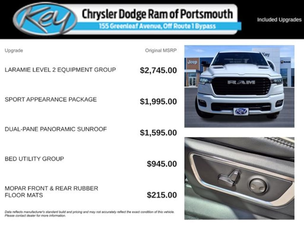 Key Chrysler Dodge Ram of Portsmouth is proud to present you with another True Market Priced Vehicle. This 2026 Ram 1500 Laramie is loaded with the following Factory Options: Bed Utility Group (Exterior 115V AC Outlet and MOPAR 4 Adjustable Cargo Tie-Down Hooks), Laramie Level 2 Equipment Group (14.4" Touchscreen Display, 4G LTE Wi-Fi Hot Spot, Cluster 12" TFT Color Display, Connectivity - US/Canada, Front Passenger Interactive Display, GPS Navigation, Integrated Center Stack Radio, Power Tailgate, Rain Sensitive Windshield Wipers, SiriusXM Radio Service, and USB Host Flip), Quick Order Package 21H Laramie, Sport Appearance Package (Accent Color Premium Power Mirrors, Auto Power-Folding Mirrors, Auto-Dimming Exterior Driver Mirror, Black Interior Accents, Black Painted Exterior Mirrors Caps, Body Color Front Bumper, Bridgestone Brand Tires, Convex Wide-Angle Exterior Mirror Insert, Exterior Mirrors Courtesy Lamps, Grille Surround 3 Body Color Tex 2 Black, RAM Grille Badge - Chrome, and Sport Performance Hood), 10 Speakers, 3.55 Rear Axle Ratio, 4-Wheel Disc Brakes, ABS brakes, Active Noise Control System, Air Conditioning, Alloy wheels, AM/FM radio: SiriusXM with 360L, Apple CarPlay/Android Auto, Audio memory, Auto High-beam Headlights, Auto-dimming door mirrors, Auto-dimming Rear-View mirror, Automatic temperature control, Brake assist, Bumpers: chrome, Chrome Exterior Mirrors, Compass, Delay-off headlights, Dome Dual LED Reading Lamp, Driver door bin, Driver vanity mirror, Dual front impact airbags, Dual front side impact airbags, Dual-Pane Panoramic Sunroof, Electronic Stability Control, Front anti-roll bar, Front Bucket Seats, Front Center Armrest w/Storage, Front dual zone A/C, Front fog lights, Front License Plate Bracket, Front reading lights, Front wheel independent suspension, Fully automatic headlights, Garage door transmitter, Heated door mirrors, Heated front seats, Heated rear seats, Heated steering wheel, Illuminated entry, Leather steering wheel, Leather Trimmed Bucket Seats, LED Dome/Reading Lamp, Low tire pressure warning, Manufacturer's Statement of Origin, Memory seat, Navigation System, Occupant sensing airbag, Off-Road Information Pages, Outside temperature display, Overhead airbag, Overhead console, Panic alarm, ParkView Rear Back-Up Camera, Passenger door bin, Passenger vanity mirror, Power door mirrors, Power driver seat, Power passenger seat, Power steering, Power windows, Radio data system, Rear anti-roll bar, Rear reading lights, Rear seat center armrest, Rear step bumper, Remote keyless entry, Security system, Speed control, Split folding rear seat, Steering wheel mounted audio controls, Tachometer, Telescoping steering wheel, Tilt steering wheel, Traction control, Trip computer, Turn signal indicator mirrors, Variably intermittent wipers, Ventilated front seats, Voltmeter, and Wheels: 20" x 9" Premium Paint/Polish!!