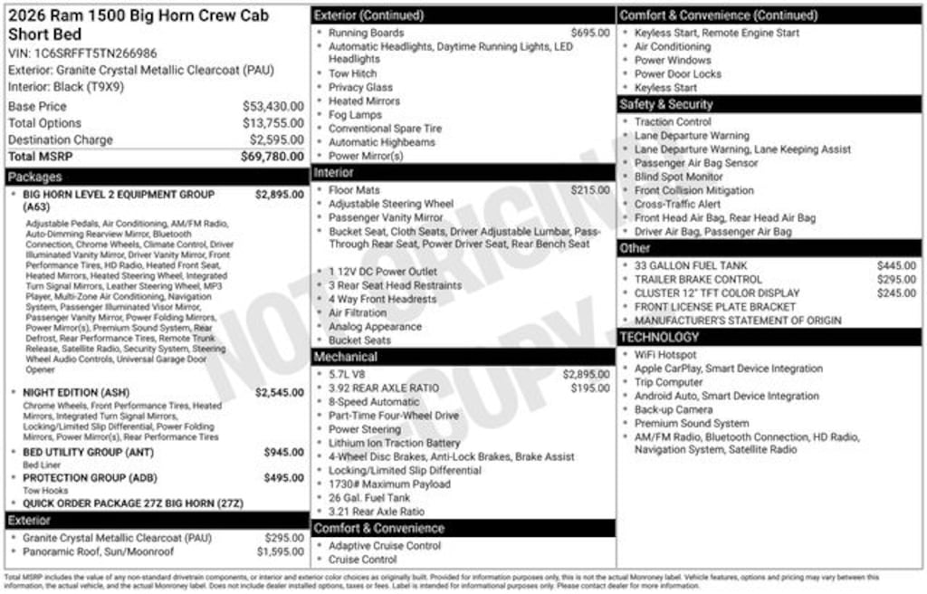 Key Chrysler Dodge Ram of Portsmouth is proud to present you with another True Market Priced Vehicle. This 2026 Ram 1500 Big Horn/Lone Star is loaded with the following Factory Options: Bed Utility Group (Exterior 115V AC Outlet, MOPAR 4 Adjustable Cargo Tie-Down Hooks, MOPAR Spray in Bedliner, and Pick-Up Box Lighting), Big Horn Level 2 Equipment Group (115V Auxiliary Power Outlet, 115V Auxiliary Rear Power Outlet, 12" Touchscreen Display, 2nd Row in Floor Storage Bins, 3 Rear Seat Head Restraints, 4 Way Front Headrests, 400W Inverter, 4G LTE Wi-Fi Hot Spot, 9 Amplified Speakers with Subwoofer, Air Conditioning ATC with Dual Zone Control, Apple CarPlay, Auto Power-Folding Mirrors, Auto-Dimming Exterior Driver Mirror, Auto-Dimming Rear-View Mirror, Black Exterior Mirrors, Black Premium Power Mirrors, Body Color Fender Flares, Bucket Seats, Center Console Parts Module, Cluster 7.0" TFT Color Display, Configurable Drive Mode, Connected Travel and Traffic Services, Connectivity - US/Canada, Convex Wide-Angle Exterior Mirror Insert, Deluxe Cloth Bucket Seats, Disassociated Touchscreen Display, Exterior Mirrors Courtesy Lamps, Exterior Mirrors with Heating Element, Exterior Mirrors with Supplemental Signals, Front Seat Back Map Pockets, Full Length Floor Console, Global Telematics Box Module, Glove Box Lamp, Google Android Auto, GPS Antenna Input, GPS Navigation, HD Radio, Heated Front Seats, Heated Steering Wheel, Integrated Center Stack Radio, Integrated Voice Command with Bluetooth, Leather Wrapped Steering Wheel, LED Dome Lamp with on/Off Switch, LED Footwell Lighting, Manual Adjust 4-Way Front Passenger Seat, Media Hub with 2 Charge Only USBs, Overhead LED Lamps, Power 2-Way Driver Lumbar Adjust, Power Adjust 8-Way Driver Seat, Power Adjustable Pedals, Premium Overhead Console, Radio: Uconnect 5 Navigation with 12.0" Display, Rear 60/40 Folding Seat, Rear Center Armrest, Rear Power Sliding Window, Rear Window Defroster, Remote Tailgate Release, Security Alarm, SiriusXM Radio Service, SiriusXM with 360L, Steering Wheel Mounted Audio Controls, Sun Visors with Illuminated Vanity Mirrors, Universal Garage Door Opener, and USB Host Flip), Night Edition (Accent Color Door Handles, Accent Color Premium Power Mirrors, Accent Color Tailgate Handle, Anti-Spin Differential Rear Axle, Black Exterior Truck Badging, Black Headlamp Bezels, Black Interior Accents, Black Painted Exterior Mirrors Caps, Black Tail Lamp Bezels, Body Color Front Bumper, Body Color Rear Bumper with Step Pads, Dual Exhaust with Black Tips, Grille Black Surround Black Mesh, RAM Grille Badge - Black, and Wheels: 20" x 9.0" Aluminum Painted Clad), Protection Group (Tow Hooks), Quick Order Package 27Z Big Horn, 33 Gallon Fuel Tank, 4-Wheel Disc Brakes, 48V Belt Starter Generator, 6 Speakers, ABS brakes, Air Conditioning, Alloy wheels, AM/FM radio, Apple CarPlay/Android Auto, Auto High-