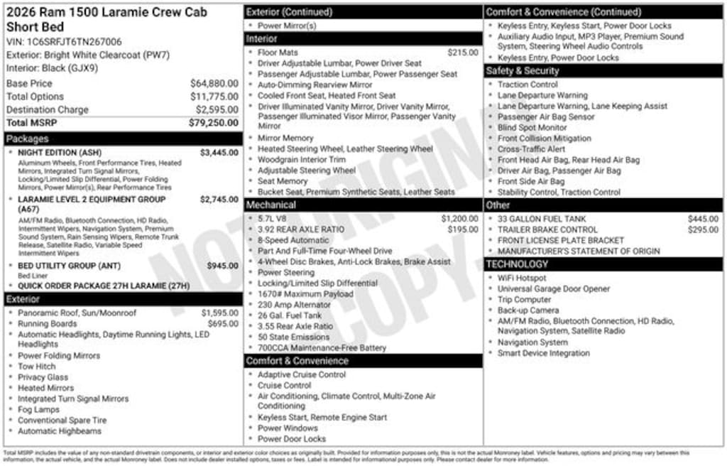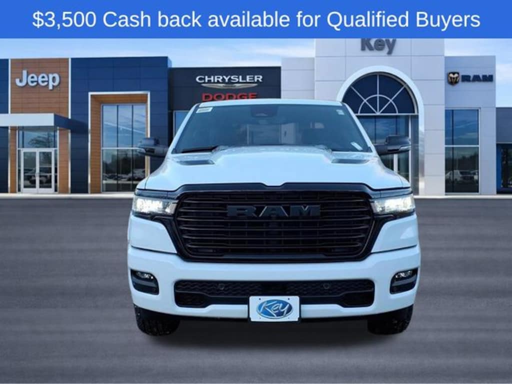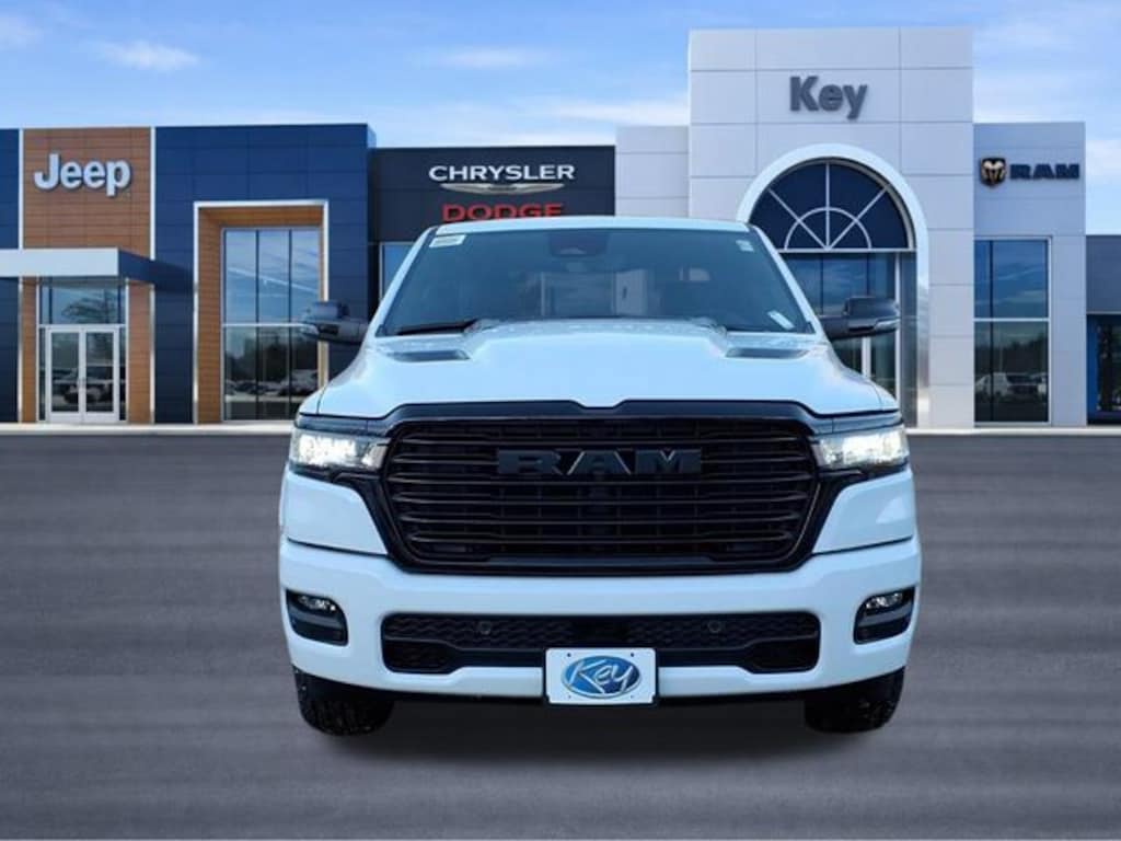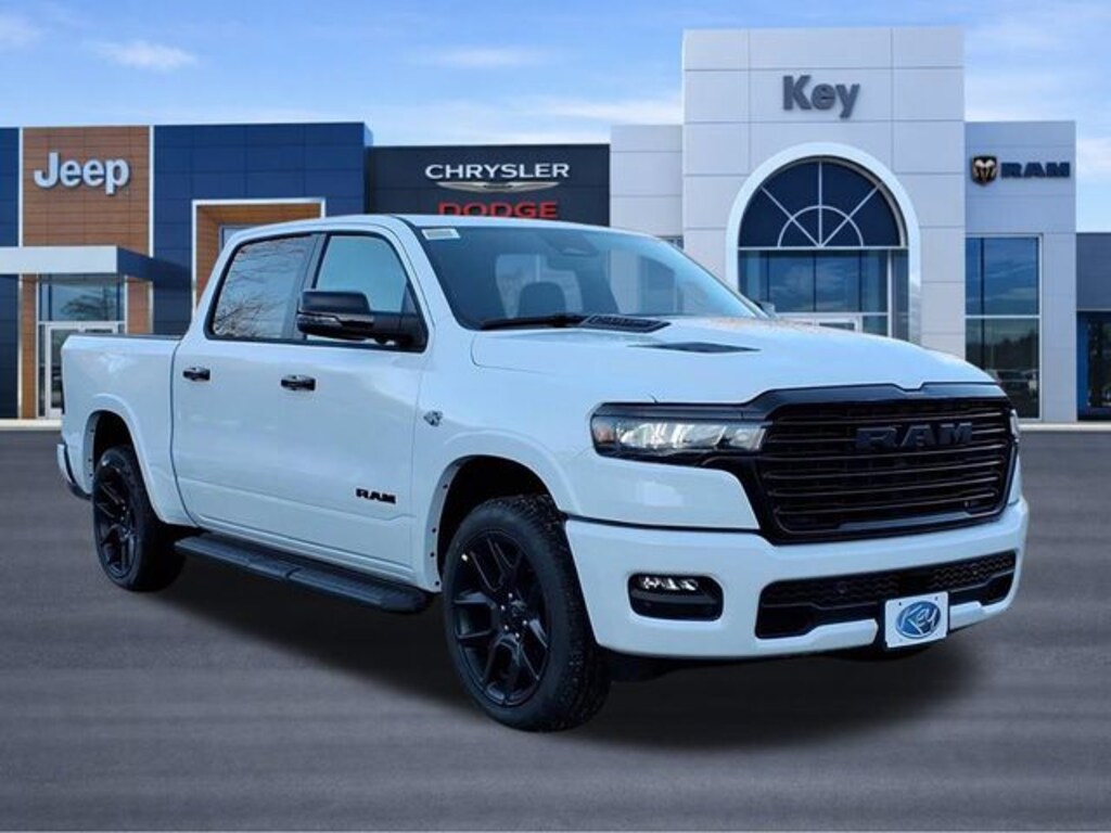 Key Chrysler Dodge Jeep Ram Newcastle is proud to present you with another True Market Priced Vehicle. This 2026 Ram 1500 Laramie is loaded with the following Factory Options: Bed Utility Group (Exterior 115V AC Outlet, MOPAR 4 Adjustable Cargo Tie-Down Hooks, and MOPAR Spray in Bedliner), Laramie Level 2 Equipment Group (14.4" Touchscreen Display, 4G LTE Wi-Fi Hot Spot, Cluster 12" TFT Color Display, Connected Travel and Traffic Services, Connectivity - US/Canada, Front Passenger Interactive Display, GPS Navigation, Harman/Kardon 19 Speaker Premium Sound, Integrated Center Stack Radio, Integrated Voice Command with Bluetooth, Power Tailgate, Radio: Uconnect 5 Nav with 14.4" Display, Rain Sensitive Windshield Wipers, SiriusXM Radio Service, SiriusXM with 360L, and USB Host Flip), Night Edition (Accent Color Door Handles, Accent Color Premium Power Mirrors, Accent Color Tailgate Handle, Anti-Spin Differential Rear Axle, Auto Power-Folding Mirrors, Auto-Dimming Exterior Driver Mirror, Black Exterior Truck Badging, Black Headlamp Bezels, Black Interior Accents, Black Painted Exterior Mirrors Caps, Black Tail Lamp Bezels, Body Color Front Bumper, Body Color Rear Bumper with Step Pads, Convex Wide-Angle Exterior Mirror Insert, Dual Exhaust with Black Tips, Exterior Mirrors Approach Lamps, Exterior Mirrors Courtesy Lamps, Exterior Mirrors with Heating Element, Exterior Mirrors with Memory, Exterior Mirrors with Supplemental Signals, Grille Surround 3 Black Texture 2 Black, Pirelli Brand Tires, Proximity Approach/Departure Lamps, RAM Grille Badge - Black, Sport Performance Hood, and Wheels: 22" x 9" Forged Aluminum), Quick Order Package 27H Laramie, 10 Speakers, 33 Gallon Fuel Tank, 4-Wheel Disc Brakes, ABS brakes, Active Noise Control System, Adjustable pedals, Air Conditioning, Alloy wheels, AM/FM radio: SiriusXM with 360L, Apple CarPlay/Android Auto, Audio memory, Auto High-beam Headlights, Auto-dimming door mirrors, Auto-dimming Rear-View mirror, Automatic temperature control, Brake assist, Bumpers: chrome, Chrome Exterior Mirrors, Compass, Delay-off headlights, Dome Dual LED Reading Lamp, Driver door bin, Driver vanity mirror, Dual front impact airbags, Dual front side impact airbags, Dual-Pane Panoramic Sunroof, Electronic Stability Control, Front anti-roll bar, Front Bucket Seats, Front Center Armrest w/Storage, Front dual zone A/C, Front fog lights, Front License Plate Bracket, Front reading lights, Front wheel independent suspension, Fully automatic headlights, Garage door transmitter, Heated door mirrors, Heated Front seats, Heated rear seats, Heated steering wheel, Illuminated entry, Leather steering wheel, Leather Trimmed Bucket Seats, LED Dome/Reading Lamp, Low tire pressure warning, Manufacturer's Statement of Origin, Memory seat, Mopar Black Tubular Side Steps, MOPAR Front and Rear Rubber Floor Mats, Navigation System, Occupant sensing airbag, Off-Road Information Pages, Outside temperature display, Overhead airbag, Overhead console, Panic alarm, ParkView Rear Back-Up Camera, Passenger door bin, Passenger vanity mirror, Pedal memory, Power door mirrors, Power driver seat, Power passenger seat, Power steering, Power windows, Radio data system, Radio: Uconnect 5 Navigation with 12.0" Display, RAM Grille Badge - Chrome, Rear anti-roll bar, Rear reading lights, Rear seat center armrest, Rear step bumper, Remote keyless entry, Security system, Speed control, Split fold