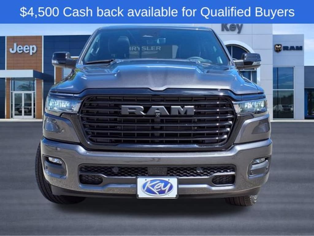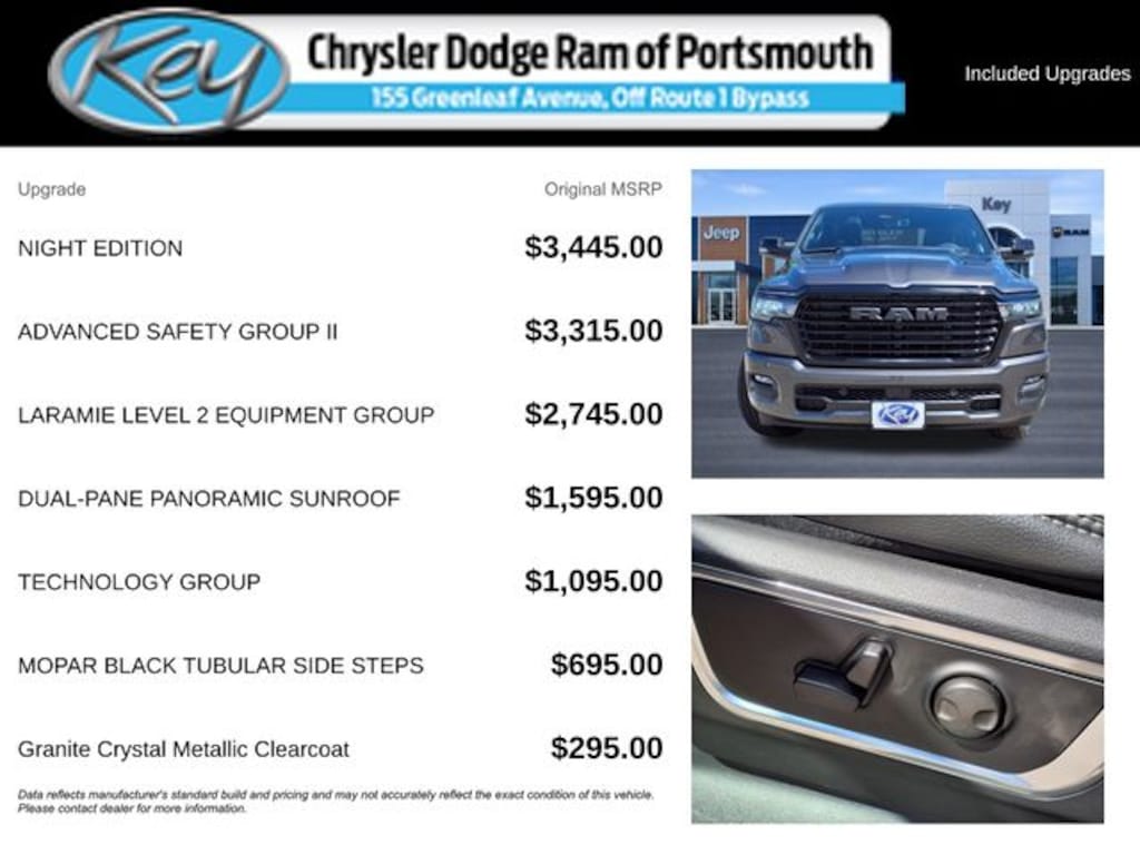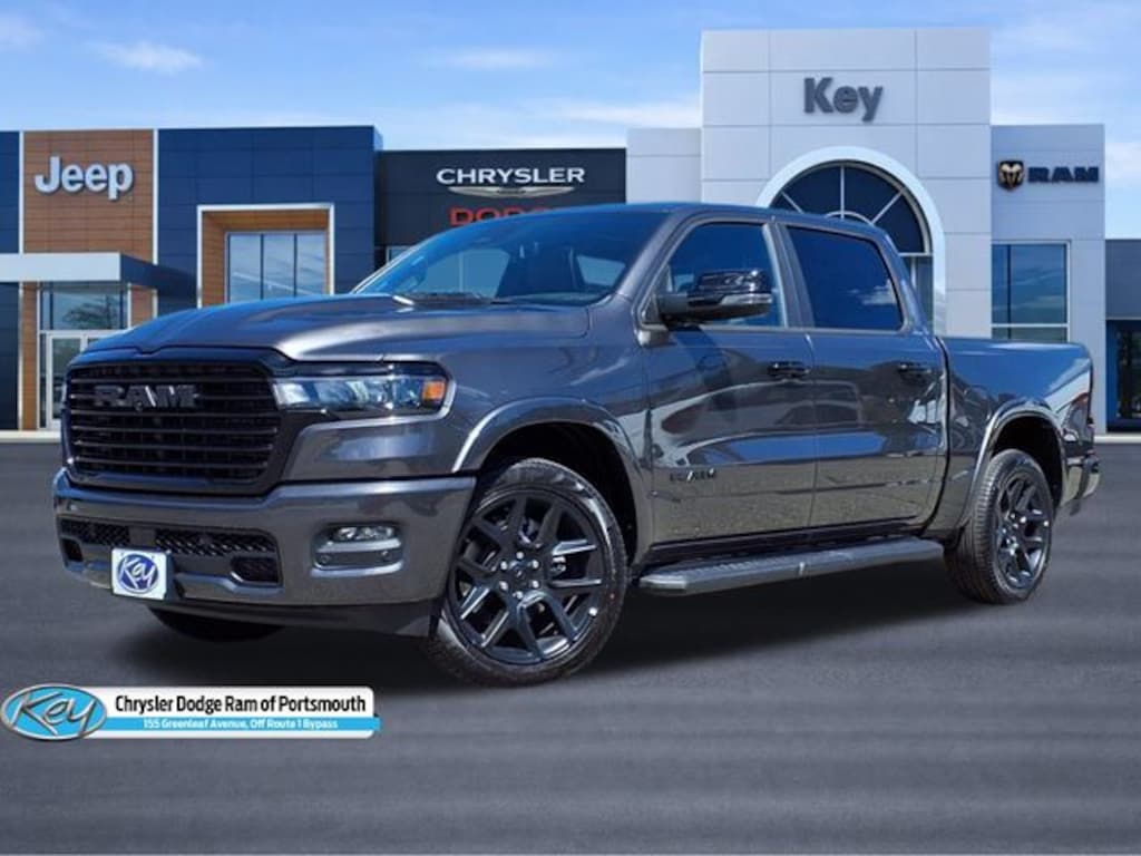 Key Chrysler Dodge Ram of Portsmouth is proud to present you with another True Market Priced Vehicle. This 2026 Ram 1500 Laramie is loaded with the following Factory Options: Advanced Safety Group II (12-Way/1-Way Trailer Connector, Active Driving Assist System, Drowsy Driver Detection, Evasive Steer Assist, Exterior Mirrors Approach Lamps, Intersection Collision Assist System, Surround View Camera System, and Traffic Sign Recognition), Laramie Level 2 Equipment Group (14.4" Touchscreen Display, 4G LTE Wi-Fi Hot Spot, Cluster 12" TFT Color Display, Connectivity - US/Canada, Front Passenger Interactive Display, GPS Navigation, Integrated Center Stack Radio, Power Tailgate, Rain Sensitive Windshield Wipers, SiriusXM Radio Service, and USB Host Flip), Night Edition (Accent Color Door Handles, Accent Color Premium Power Mirrors, Accent Color Tailgate Handle, Anti-Spin Differential Rear Axle, Auto Power-Folding Mirrors, Auto-Dimming Exterior Driver Mirror, Black Exterior Truck Badging, Black Headlamp Bezels, Black Interior Accents, Black Painted Exterior Mirrors Caps, Black Tail Lamp Bezels, Body Color Front Bumper, Convex Wide-Angle Exterior Mirror Insert, Exterior Mirrors Courtesy Lamps, Grille Surround 3 Black Texture 2 Black, Pirelli Brand Tires, Proximity Approach/Departure Lamps, RAM Grille Badge - Black, Sport Performance Hood, and Wheels: 22" x 9" Forged Aluminum), Quick Order Package 21H Laramie, Technology Group (Heads-Up Display and LED CHMSL Lamp), 10 Speakers, 3.55 Rear Axle Ratio, 4-Wheel Disc Brakes, ABS brakes, Active Noise Control System, Air Conditioning, Alloy wheels, AM/FM radio: SiriusXM with 360L, Apple CarPlay/Android Auto, Audio memory, Auto High-beam Headlights, Auto-dimming door mirrors, Auto-dimming Rear-View mirror, Automatic temperature control, Brake assist, Bumpers: chrome, Chrome Exterior Mirrors, Compass, Delay-off headlights, Dome Dual LED Reading Lamp, Driver door bin, Driver vanity mirror, Dual front impact airbags, Dual front side impact airbags, Dual-Pane Panoramic Sunroof, Electronic Stability Control, Front anti-roll bar, Front Bucket Seats, Front Center Armrest w/Storage, Front dual zone A/C, Front fog lights, Front License Plate Bracket, Front reading lights, Front wheel independent suspension, Fully automatic headlights, Garage door transmitter, Heated door mirrors, Heated front seats, Heated rear seats, Heated steering wheel, Illuminated entry, Leather steering wheel, Leather Trimmed Bucket Seats, LED Dome/Reading Lamp, Low tire pressure warning, Manufacturer's Statement of Origin, Memory seat, Mopar Black Tubular Side Steps, Navigation System, Occupant sensing airbag, Off-Road Information Pages, Outside temperature display, Overhead airbag, Overhead console, Panic alarm, ParkView Rear Back-Up Camera, Passenger door bin, Passenger vanity mirror, Power door mirrors, Power driver seat, Power passenger seat, Power steering, Power windows, Radio data sys