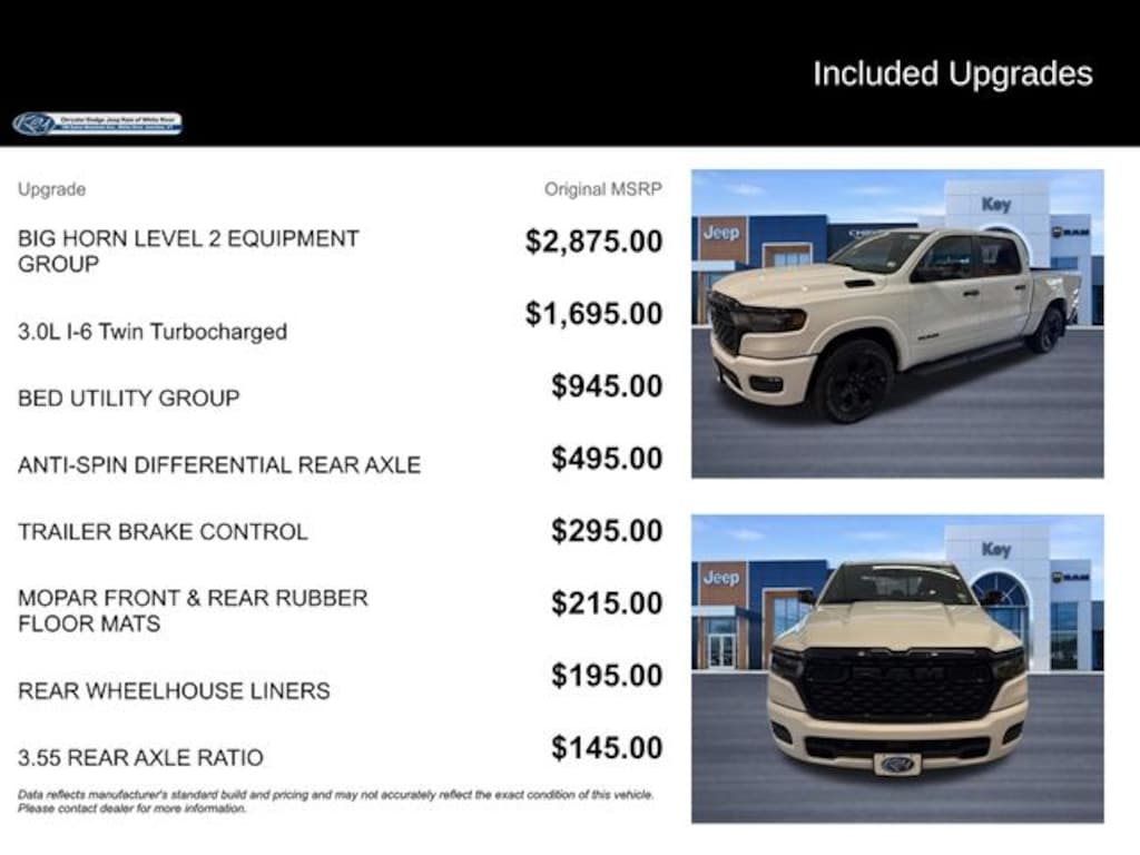 Key Chrysler Dodge Jeep Ram of White River is proud to present you with another True Market Priced Vehicle. This 2026 Ram 1500 Big Horn/Lone Star is loaded with the following Factory Options: Bed Utility Group (Exterior 115V AC Outlet, MOPAR 4 Adjustable Cargo Tie-Down Hooks, MOPAR Spray in Bedliner, and Pick-Up Box Lighting), Big Horn Level 2 Equipment Group (115V Auxiliary Power Outlet, 115V Auxiliary Rear Power Outlet, 12" Touchscreen Display, 2nd Row in Floor Storage Bins, 3 Rear Seat Head Restraints, 4 Way Front Headrests, 400W Inverter, 4G LTE Wi-Fi Hot Spot, 9 Amplified Speakers with Subwoofer, Air Conditioning ATC with Dual Zone Control, Apple CarPlay, Auto Power-Folding Mirrors, Auto-Dimming Exterior Driver Mirror, Auto-Dimming Rear-View Mirror, Black Exterior Mirrors, Black Premium Power Mirrors, Body Color Fender Flares, Bucket Seats, Center Console Parts Module, Cluster 7.0" TFT Color Display, Configurable Drive Mode, Connected Travel and Traffic Services, Connectivity - US/Canada, Convex Wide-Angle Exterior Mirror Insert, Deluxe Cloth Bucket Seats, Disassociated Touchscreen Display, Exterior Mirrors Courtesy Lamps, Exterior Mirrors with Heating Element, Exterior Mirrors with Supplemental Signals, Front Seat Back Map Pockets, Full Length Floor Console, Global Telematics Box Module, Glove Box Lamp, Google Android Auto, GPS Antenna Input, GPS Navigation, HD Radio, Heated Front Seats, Heated Steering Wheel, Integrated Center Stack Radio, Integrated Voice Command with Bluetooth, Leather Wrapped Steering Wheel, LED Dome Lamp with on/Off Switch, LED Footwell Lighting, Manual Adjust 4-Way Front Passenger Seat, Media Hub with 2 Charge Only USBs, Overhead LED Lamps, Power 2-Way Driver Lumbar Adjust, Power Adjust 8-Way Driver Seat, Power Adjustable Pedals, Premium Overhead Console, Radio: Uconnect 5 Navigation with 12.0" Display, Rear 60/40 Folding Seat, Rear Center Armrest, Rear Power Sliding Window, Rear Window Defroster, Remote Tailgate Release, Security Alarm, SiriusXM Radio Service, SiriusXM with 360L, Steering Wheel Mounted Audio Controls, Sun Visors with Illuminated Vanity Mirrors, Universal Garage Door Opener, and USB Host Flip), Night Edition (Accent Color Door Handles, Accent Color Premium Power Mirrors, Accent Color Tailgate Handle, Anti-Spin Differential Rear Axle, Black Exterior Truck Badging, Black Headlamp Bezels, Black Interior Accents, Black Painted Exterior Mirrors Caps, Black Tail Lamp Bezels, Body Color Front Bumper, Body Color Rear Bumper with Step Pads, Dual Exhaust with Black Tips, Grille Black Surround Black Mesh, RAM Grille Badge - Black, and Wheels: 20" x 9.0" Aluminum Painted Clad), Quick Order Package 21Z Big Horn, 4-Wheel Disc Brakes, 48V Belt Starter Generator, 6 Speakers, ABS brakes, Air Conditioning, Alloy wheels, AM/FM radio, Apple CarPlay/Android Auto, Auto High-beam Headlights, Brake assist, Bumpers: chrome, Cloth Bucket Seats, Compass, Delay-off headlights, Driver door bin, Dual front impact airbags, Dual front side impact airbags, Electronic Stability Control, Front anti-roll bar, Front Bucket Seats, Front Center Armrest w/Storage, Front fog lights,