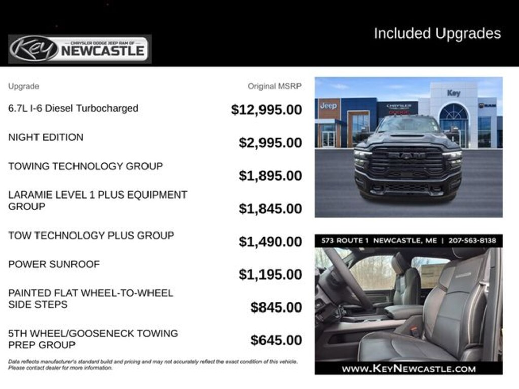 Key Chrysler Dodge Jeep Ram Newcastle is proud to present you with another True Market Priced Vehicle. This 2026 Ram 2500 Laramie is loaded with the following Factory Options: Laramie Level 1 Plus Equipment Group (#1 Seat Foam Cushion, 115V Auxiliary Rear Power Outlet, 2 Way Rear Headrest Seat, 2nd Row in Floor Storage Bins, 4 Way Front Headrests, Active Lane Management System, Adaptive Steering System, Anti-Spin Differential Rear Axle, Auto Adjust in Reverse Exterior Mirrors, Auto Dim Exterior Mirror, Auto High Beam Headlamp Control, Auto Power-Folding Mirrors, Auto-Dimming Exterior Passenger Mirror, Bucket Seats, Center Stop Lamp with Cargo View Camera, Chrome Exterior Mirrors, Drowsy Driver Detection, Dual Wireless Charging Pad, Exterior Mirrors Courtesy Lamps, Exterior Mirrors with Heating Element, Exterior Mirrors with Memory, Exterior Mirrors with Supplemental Signals, Foam Bottle Insert (door Trim Panel), Folding Flat Load Floor Storage, Forward and Reverse Utility Lights, Front Seat Back Map Pockets, Full Length Upgraded Floor Console, Heated Front Seats, Heated Steering Wheel, High Back Seats, Leather Trimmed Bucket Seats, LED Bed Lighting, Mirror Running Lights, MOPAR Deployable Bed Step, MOPAR Spray in Bedliner, Power 2-Way Driver Lumbar Adjust, Power 2-Way Passenger Lumbar Adjust, Power Adjust 8-Way Driver Seat, Power Adjust 8-Way Front Passenger Seat, Power Adjust Mirrors, Power Adjustable Pedals with Memory, Power Heated Fold Telescopic Mirrors with Memory, Power Telescoping Mirrors, Power-Adjustable Convex Aux Mirrors, Radio/Driver Seat/Mirrors/Pedals Memory, Rain Sensitive Windshield Wipers, Rear 60/40 Folding Seat, Remote Tailgate Release, Traffic Sign Recognition, and Ventilated Front Seats), Night Edition (Black Exterior Mirrors, Black Exterior Truck Badging, Black Wheel Center Hub, Body Color Grille-Surround, Gloss Black Grille Billets/Accents, Sport Performance Hood, and Wheels: 20" x 8.0" Black Painted Aluminum), Quick Order Package 24H Laramie, Tow Technology Plus Group (Digital 3.0 Rear View Auto Dimming Mirror and Trailer Reverse Steering Control), Towing Technology Group (Surround View Camera System, Trailer Reverse Guidance, and Trailer Tire Pressure Monitoring System), 10 Speakers, 4-Wheel Disc Brakes, 4G LTE Wi-Fi Hot Spot, 5th Wheel/Gooseneck Towing Prep Group, ABS brakes, Air Conditioning, Alexa Built-in, Alloy wheels, AM/FM radio: SiriusXM with 360L, Apple CarPlay, Apple CarPlay/Android Auto, Auto-dimming Rear-View mirror, Automatic temperature control, Brake assist, Bumpers: body-color, Clearance Lamps, Compass, Connected Travel and Traffic Services, Connectivity - US/Canada, Delay-off headlights, Disassociated Touchscreen Display, Driver door bin, Driver vanity mirror, Dual Alternators Rated At 480 Amps, Dual front impact airbags, Dual front side impact airbags, Electronic Stability Control, Emergency Vehicle Alert System (EVAS), For Details, Visit DriveUconnect.com, For More Info, Call 800-643-2112, Front anti-roll bar, Front Center Armrest w/Storage, Front dual zone A/C, Front fog lights, Front License Plate Bracket, Front reading lights, Fully automatic headlights, Garage door transmitter, Global Telematics Box Module, Google Android Auto, GPS Antenna Input, GPS Navigation, HD Radio, Heated door mirrors, Heated Front seats, Heated steering wheel, Illuminated entry, Integrated Voice Command with Bluetooth, Leather Trim 40/20/40