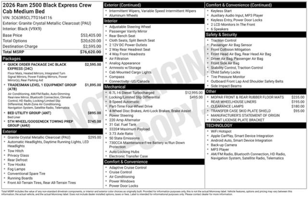 Key Chrysler Dodge Ram of Portsmouth is proud to present you with another True Market Priced Vehicle. This 2026 Ram 2500 Tradesman is loaded with the following Factory Options: Bed Utility Group (LED Bed Lighting, MOPAR Deployable Bed Step, and MOPAR Spray in Bedliner), Quick Order Package 24C Black Express (2 Way Rear Headrest Seat, 4 Way Front Headrests, 40/20/40 Split Bench Seat, Auto Power-Folding Mirrors, Black Exterior Mirrors, Black Wheel Center Hub, Body Color Grille-Surround, Carpet Floor Covering, Cloth 40/20/40 Bench Seat, Exterior Mirrors Courtesy Lamps, Exterior Mirrors with Heating Element, Exterior Mirrors with Supplemental Signals, Forward and Reverse Utility Lights, Front and Rear Floor Mats, Front Armrest with Cupholders, Manual Adjust 4-Way Driver Seat, Manual Adjust 4-Way Front Passenger Seat, Mirror Running Lights, Mopar Black Tubular Side Steps, Painted Front Bumper, Painted Rear Bumper, ParkSense Front/Rear Park Assist System, Power Adjust Mirrors, Power Heated Folding Telescopic Mirrors, Power Telescoping Mirrors, Power-Adjustable Convex Aux Mirrors, Rear Folding Seat, Remote USB Port - Charge Only, Sport Performance Hood, Storage Tray, and Wheels: 20" x 8.0" Black Painted Aluminum), Tradesman Level 1 Equipment Group (115-Volt Auxiliary Front Power Outlet, 12" Touchscreen Display, 400W Inverter, 4G LTE Wi-Fi Hot Spot, Air Conditioning ATC with Dual Zone Control, Alexa Built-in, Apple CarPlay, Auto-Dimming Rear-View Mirror, Connected Travel and Traffic Services, Connectivity - US/Canada, Disassociated Touchscreen Display, Emergency Vehicle Alert System (EVAS), Exterior 115V AC Outlet, For Details, Visit DriveUconnect.com, For More Info, Call 800-643-2112, Global Telematics Box Module, Google Android Auto, GPS Antenna Input, GPS Navigation, HD Radio, Integrated Voice Command with Bluetooth, Off-Road Info Pages, Radio: Uconnect 5 Navigation with 12.0" Display, Rear Power Sliding Window, Selectable Tire Fill Alert, SiriusXM Radio Service, SiriusXM with 360L, Tinted Acoustic Windshield Glass, and Trailer Tow Pages), 4-Wheel Disc Brakes, 5th Wheel/Gooseneck Towing Prep Group, 6 Speakers, ABS brakes, Air Conditioning, AM/FM radio: SiriusXM, Anti-Spin Differential Rear Axle, Apple CarPlay/Android Auto, Brake assist, Clearance Lamps, Compass, Delay-off headlights, Driver door bin, Dual front impact airbags, Dual front side impact airbags, Electronic Stability Control, Front anti-roll bar, Front Center Armrest w/Storage, Front fog lights, Front License Plate Bracket, Front reading lights, Fully automatic headlights, Illuminated entry, Low tire pressure warning, Manual Folding Exterior Mirrors, Manual Telescoping Mirrors, Manufacturer's Statement of Origin, MOPAR Front and Rear Rubber Floor Mats, Occupant sensing airbag, Outside temperature display, Overhead airbag, Overhead console, Panic alarm, ParkView Rear Back-Up Camera, Passenger door bin, Passenger vanity mirror, Pow