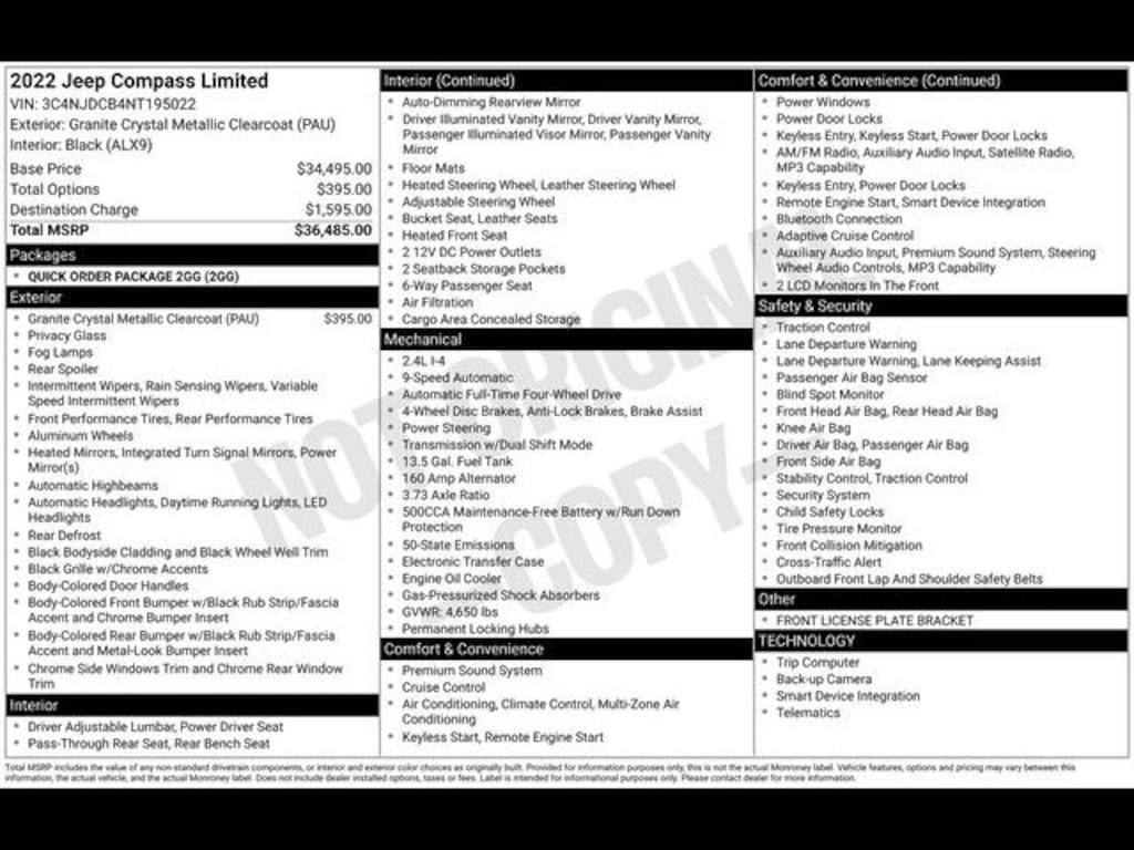 Key Chrysler Dodge Jeep Ram of Rochester is proud to present you with another True Market Priced Pre-Owned Vehicle. Transparent Pricing Of $ 23415 !! This 2022 Jeep Compass Limited is loaded with the following Factory Options: 4WD Quick Order Package 2GG, 4WD, 10.1" Touchscreen Display, 3.73 Axle Ratio, 4-Wheel Disc Brakes, 6 Speakers, ABS brakes, Air Conditioning, Alloy wheels, AM/FM radio: SiriusXM, Anti-whiplash front head restraints, Auto High-beam Headlights, Auto-dimming Rear-View mirror, Automatic temperature control, Brake assist, Bumpers: body-color, Compass, Delay-off headlights, Disassociated Touchscreen Display, Driver door bin, Driver vanity mirror, Dual front impact airbags, Dual front side impact airbags, Electronic Stability Control, Emergency communication system: SiriusXM Guardian, Four wheel independent suspension, Front anti-roll bar, Front Bucket Seats, Front Center Armrest w/Storage, Front dual zone A/C, Front fog lights, Front License Plate Bracket, Front reading lights, Fully automatic headlights, Global Telematics Box Module (TBM), Gloss Black Exterior Mirrors, Heated door mirrors, Heated front seats, Heated steering wheel, Illuminated entry, Knee airbag, Leather Shift Knob, Leather Trimmed Bucket Seats, Low tire pressure warning, Occupant sensing airbag, Outside temperature display, Overhead airbag, Overhead console, Panic alarm, ParkView Rear Back-Up Camera, Passenger door bin, Passenger vanity mirror, Power door mirrors, Power driver seat, Power steering, Power windows, Radio: Uconnect 5 w/10.1" Display, Rain sensing wipers, Rear anti-roll bar, Rear seat center armrest, Rear window defroster, Rear window wiper, Remote keyless entry, Roof rack: rails only, Security system, Speed control, Split folding rear seat, Spoiler, Steering wheel mounted audio controls, Tachometer, Telescoping steering wheel, Tilt steering wheel, Traction control, Trip computer, Turn signal indicator mirrors, Variably intermittent wipers, and Wheels: 18" x 7" Painted Diamond Cut Aluminum!!