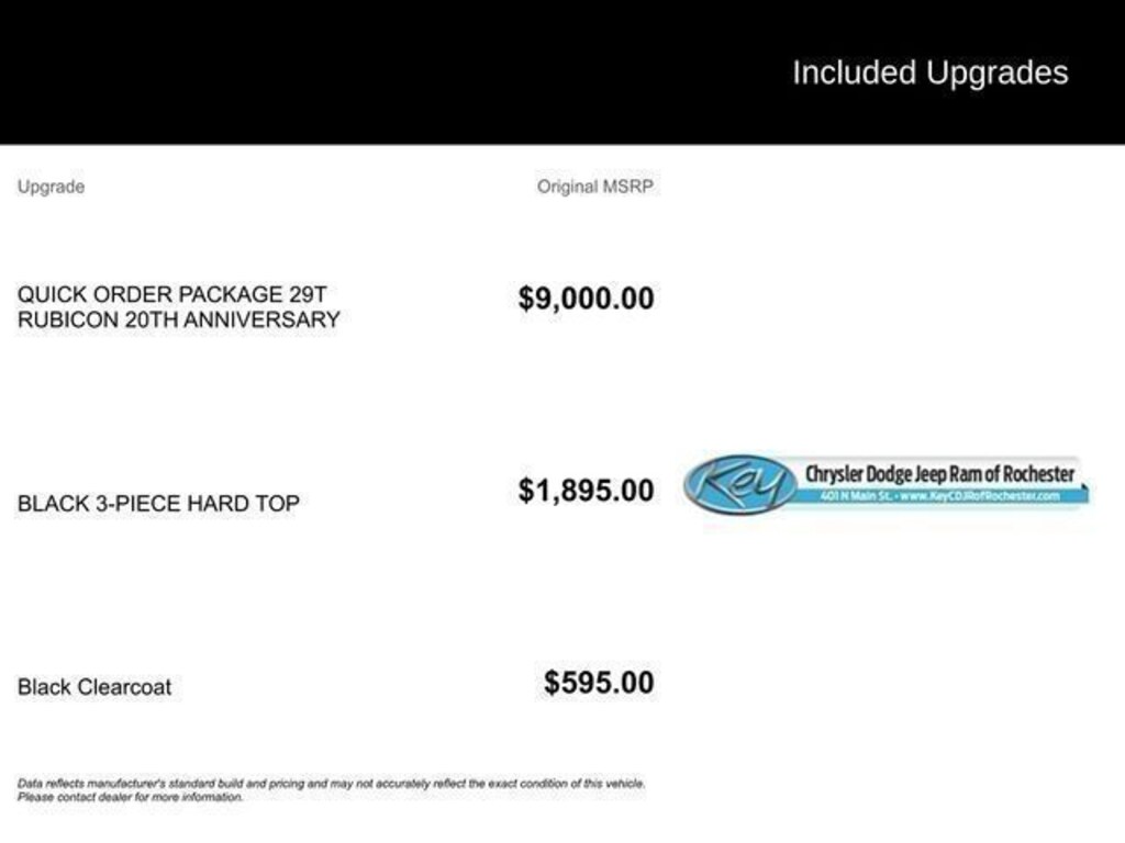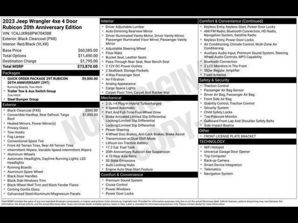 Key Chrysler Dodge Jeep Ram of Rochester is proud to present you with another True Market Priced Pre-Owned Vehicle. Transparent Pricing Of $ 32995 !! This 2023 Jeep Wrangler Rubicon 20th Anniversary Edition 4xe is loaded with the following Factory Options: 2.0L I4 DOHC, ABS brakes, Alloy wheels, Compass, Electronic Stability Control, Front dual zone A/C, Heated door mirrors, Illuminated entry, Low tire pressure warning, Navigation System, ParkView Rear Back-Up Camera, Passenger door bin, Remote keyless entry, and Traction control 2.0L I4 DOHC, ABS brakes, Alloy wheels, Compass, Electronic Stability Control, Front dual zone A/C, Heated door mirrors, Illuminated entry, Low tire pressure warning, Navigation System, ParkView Rear Back-Up Camera, Passenger door bin, Remote keyless entry, Traction control, 4-Wheel Disc Brakes, 4.10 Rear Axle Ratio, 9 Speakers, Air Conditioning, AM/FM radio: SiriusXM, Apple CarPlay/Android Auto, Auto-dimming Rear-View mirror, Automatic temperature control, Brake assist, Delay-off headlights, Driver door bin, Driver vanity mirror, Dual front impact airbags, Dual front side impact airbags, Emergency communication system: SiriusXM Guardian, Front anti-roll bar, Front Bucket Seats, Front Center Armrest w/Storage, Front fog lights, Front reading lights, Fully automatic headlights, Garage door transmitter, Integrated roll-over protection, Occupant sensing airbag, Outside temperature display, Panic alarm, Passenger vanity mirror, Performance Suspension, Power door mirrors, Power steering, Power windows, Premium Cloth Low-Back Bucket Seats, Radio data system, Radio: Uconnect 4C Nav w/8.4" Display, Rear anti-roll bar, Rear reading lights, Security system, Speed control, Split folding rear seat, Steering wheel mounted audio controls, Tachometer, Telescoping steering wheel, Tilt steering wheel, Trip computer, Variably intermittent wipers, Voltmeter, and Wheels: 17" x 7.5" Machined w/Black Pockets!!